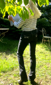 Coupe droite, légèrement stretch, ornementé de clous martelés de différentes tailles et couleurs, nickel, bronze, or.