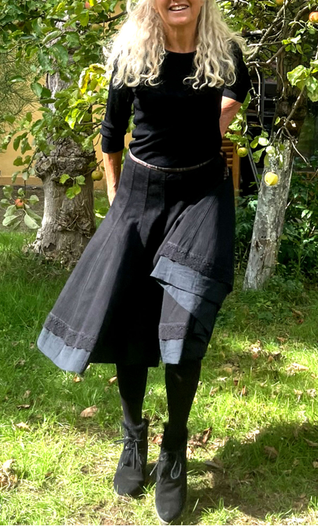 Jupe toupie. Denim noir et volants