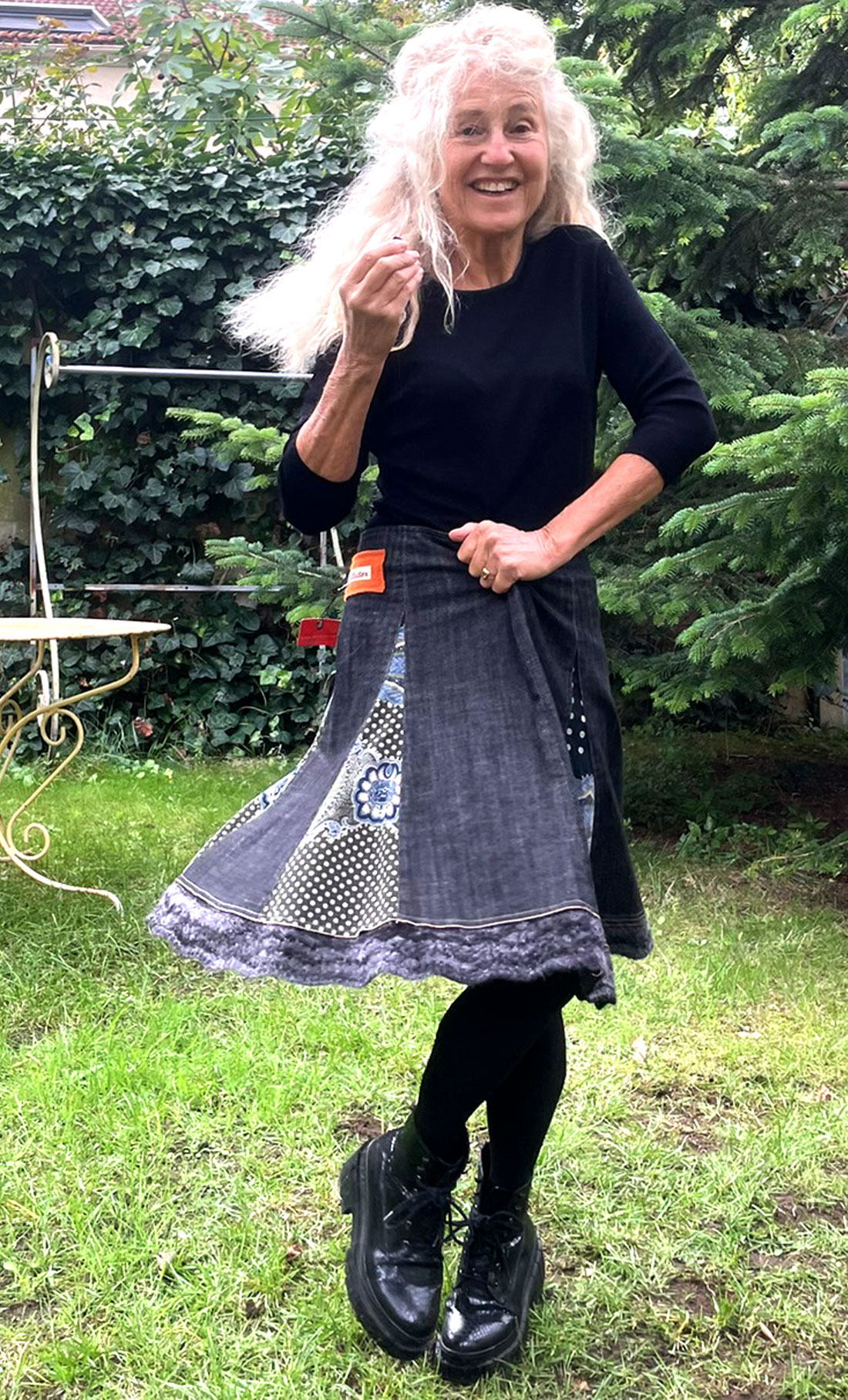 La jupe s'évase en un ballet original d'incrustations en velours imprimé Rio Bravo.