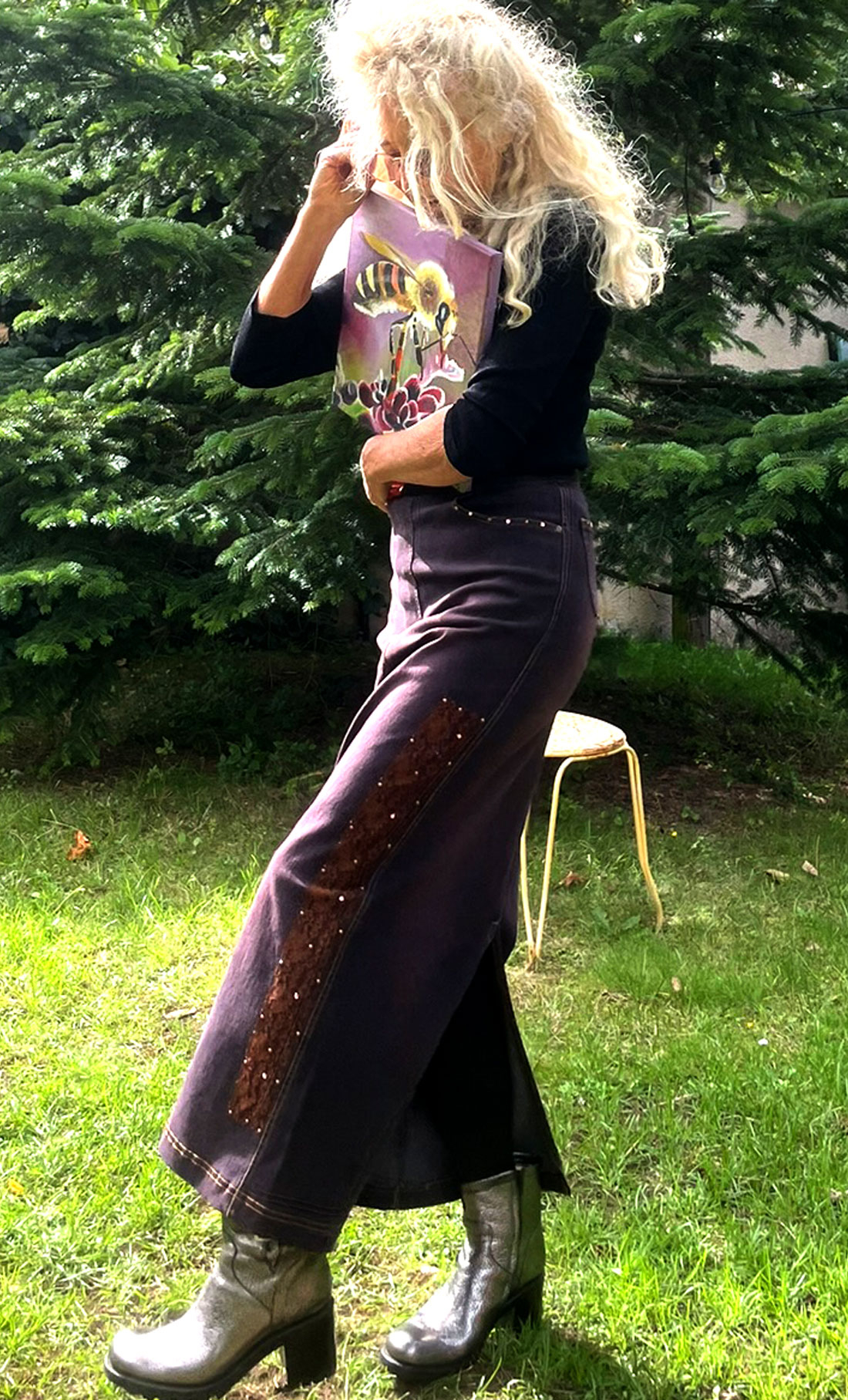 Le denim surteint en prune, brossé dans un esprit vieilli est stretch, lourd, d'une très belle qualité.