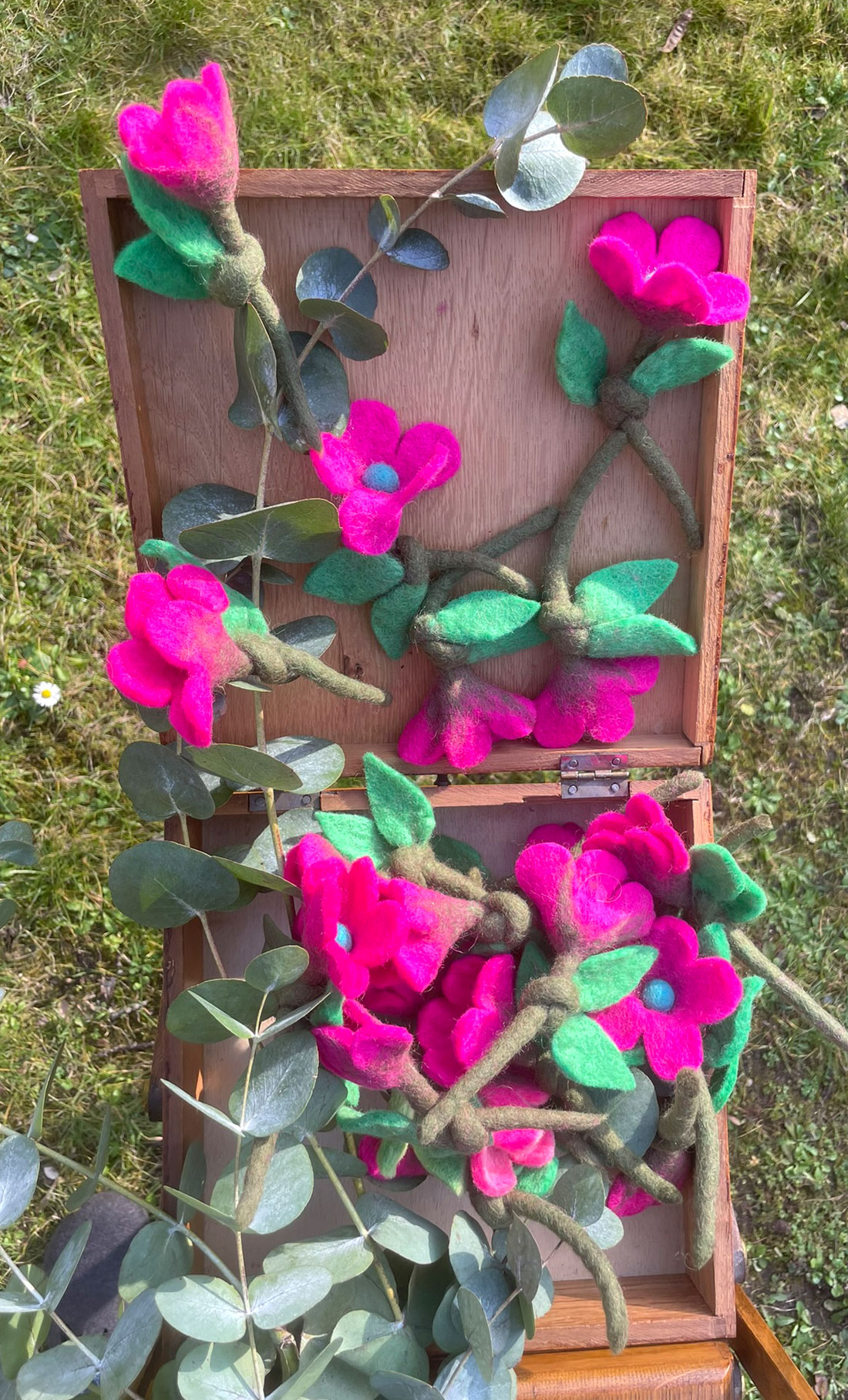 Superbes tulipes en feutrine, aux pétales rose fuchsia, aux feuilles vert printemps, au pistil bleu ciel, si réalistes ou surnaturelles que vous ferez sensation en les épinglant au revers d'un col, ou sur vos cheveux un grand soir...
