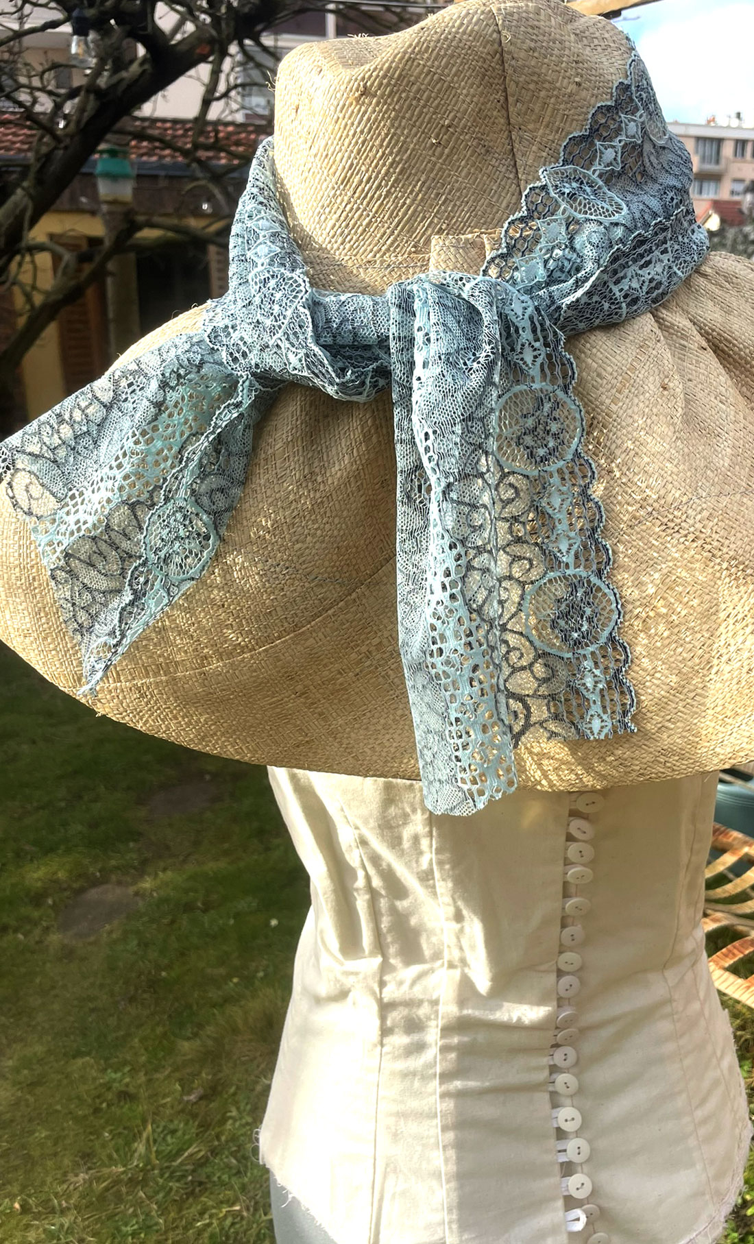 Bande dentelle bleu azur anthracite aux délicats motifs arachnéens. Création Saint André, illustre maison aujourd'hui disparue.