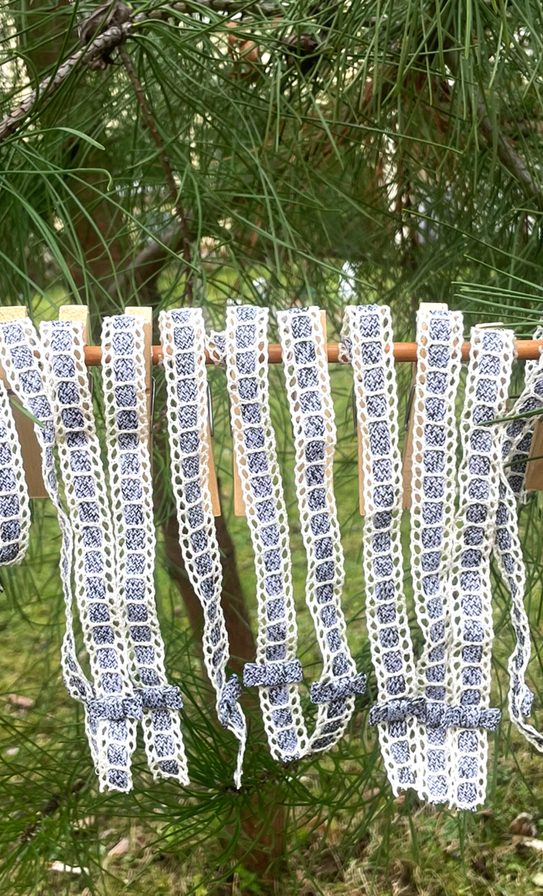 A l'époque, j'ai créé une ligne de robes dont les bretelles étaient ornementées de cet adorable galon bleu indigo. Voyez comme il coulisse dans un broderie festonnée écru. Un petit noeud achève ce savoir-faire délicieusement couture.