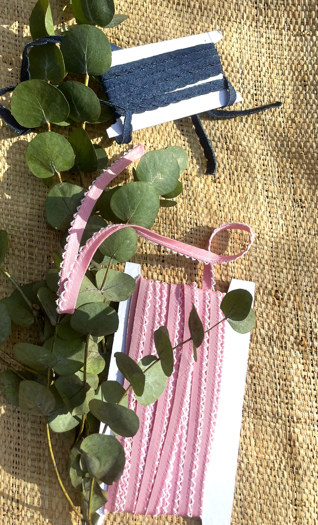 1) Passepoil en tissu diagonale rose pimpant, agrémenté d'une bouclette festonnée blanc optique, délicieuse finition pour un décolleté, une nappe, un vêtement de petite fille....