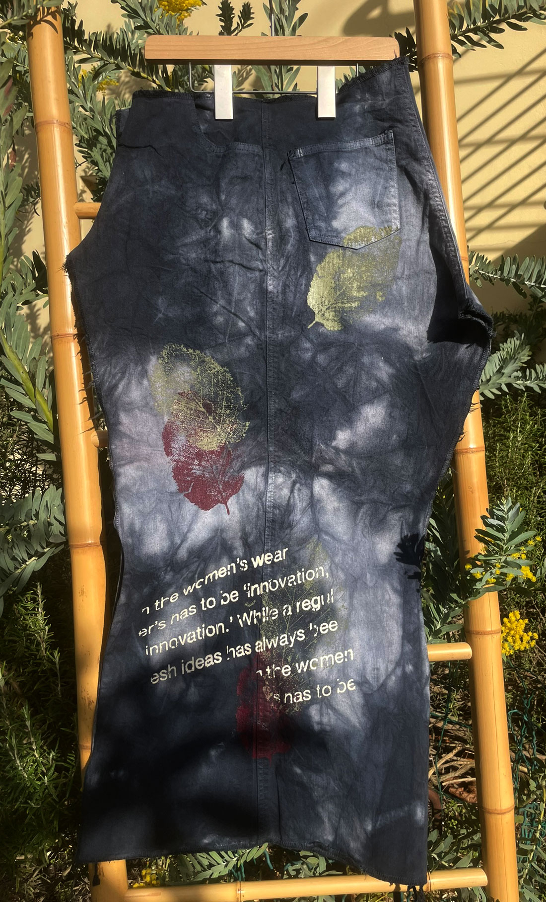 Etudes pour la création de mes pantalons Autum leaves : Montage partiel (assemblage côté, poches), traitement chez le délaveur, sérigraphie. Retour à l'usine pour le montage final....