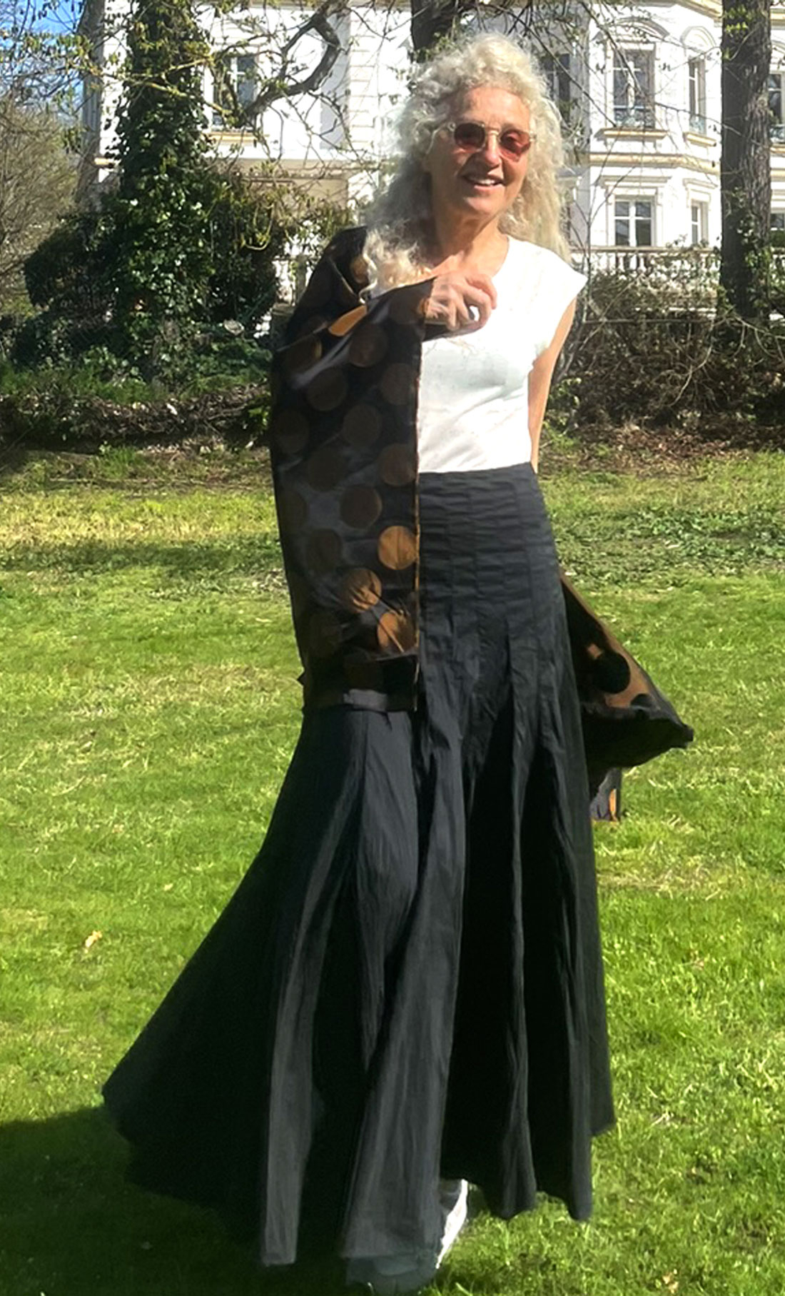 En popeline légère, la jupe m'est grande, d'autant qu'elle est stretch ! Je la tiens à pleine main pour ne pas la perdre !