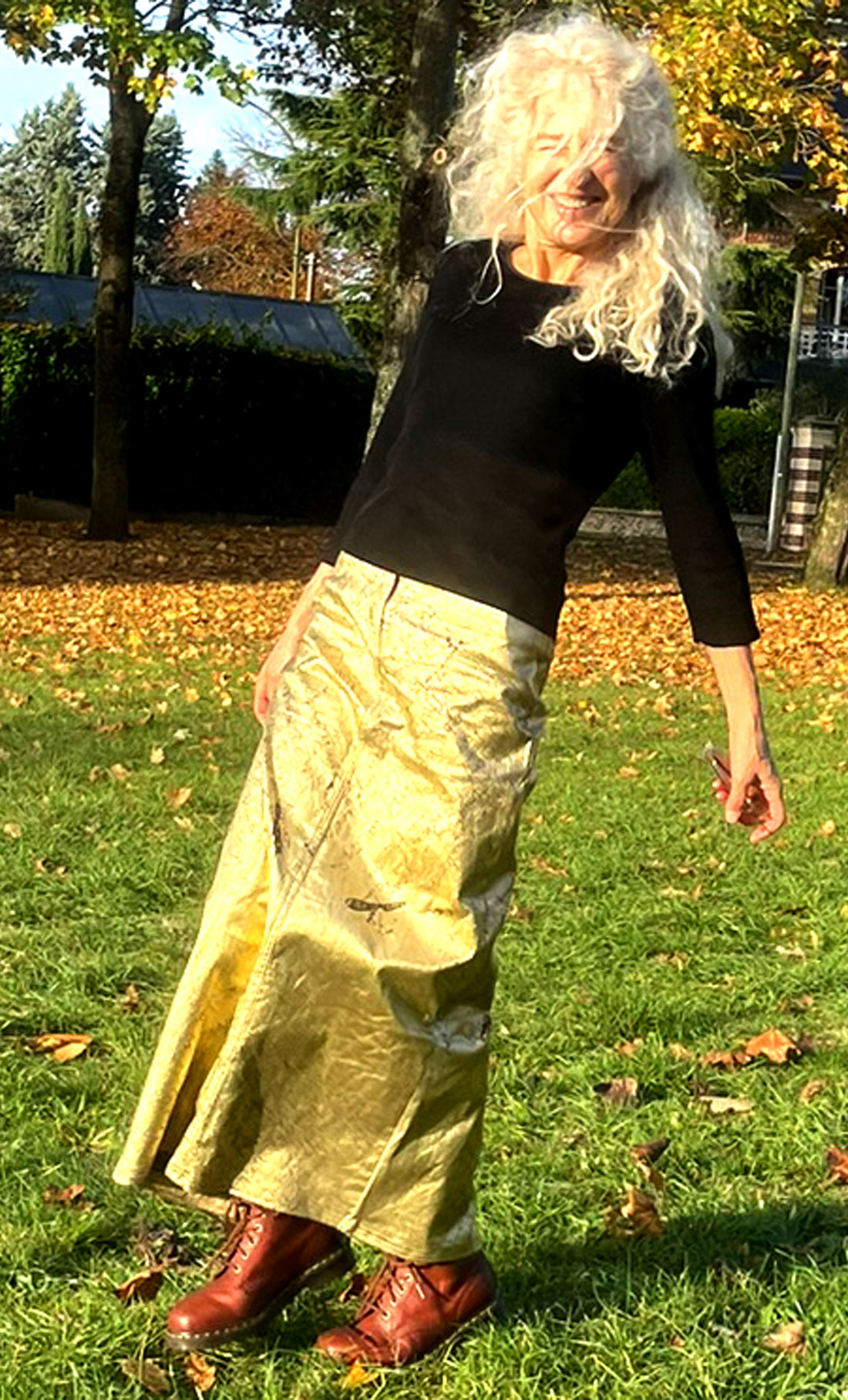Je mesure 1,66 m et je porte la taille 36. J'aime équilibrer la silhouette avec des chaussures à grosse semelle. Mais une autre idée peut s'imposer, selon votre hauteur : des chaussures plus fines, et peut-être raccourcir la jupe pour les découvrir.