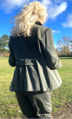Poches verticales allongeant la ligne, larges passepoils introduits en couture.