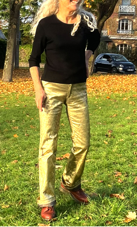 La deuxième opération est une enduction or "dévorée" laissant apparaître des écritures vert kaki, à la façon d'un carnet de voyage en négatif sur un livre d'or. Au fur et à mesure que vous le porterez, il se patinera. Au lavage, il perdra de son éclat, devenant plus vintage, de moins en moins clinquant.