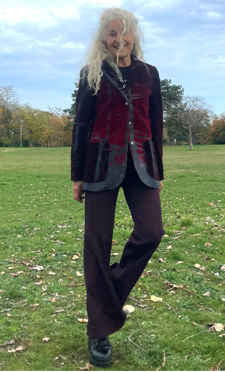 elle emprunte tous les codes des vestes de costume des années soixante-dix : col et revers, épaulettes, devant arrondis,