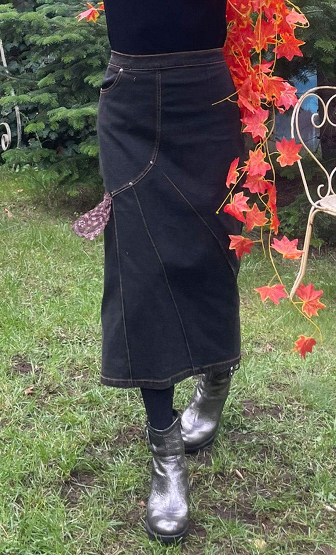 Denim et féminité : surpiqûres miel, poches, l'une plaquée, l'autre entrée arrondie sous ceinture, rivets et jackron cuir sur ceinture dos.