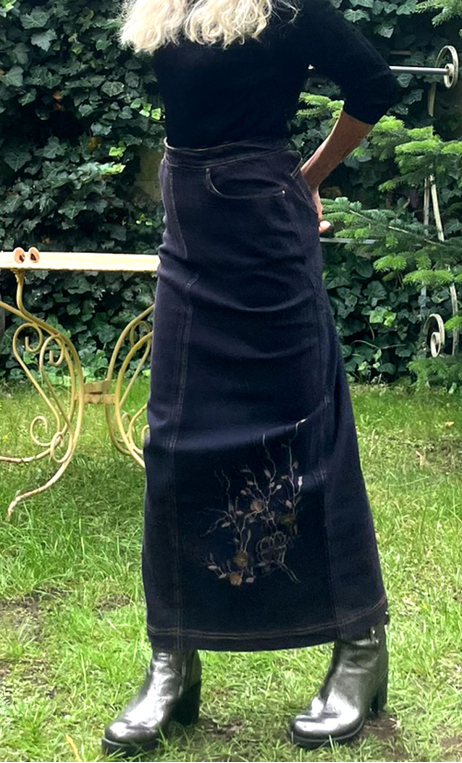 Une magnifique branche de cerisier en fleurs attire le regard. En fil satinés serrés pour les pétales, déliés pour les branches, les tons cuivrés, camel sont juste ce qu'il faut lumineux pour à la fois embellir la jupe, et ne pas contrarier vos envies de pulls, tops, chemises ou manteaux. Tout matche.