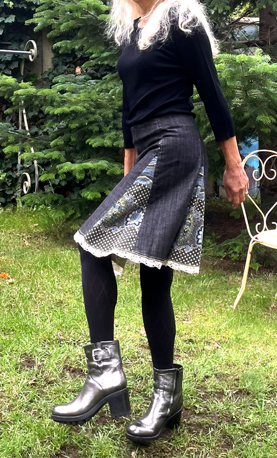 La jupe s'évase en un ballet original d'incrustations en velours imprimé Rio Bravo.
